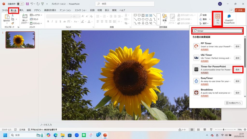 「ホーム」⇒「アドイン」⇒「アドインを検索する」に「timer」と入力し、「Timer for PowerPoint」の追加を選択する。これで初期設定は、終了です!