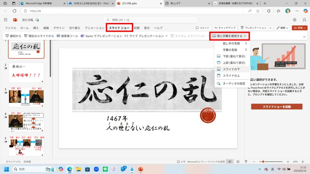 ③字幕を設定する場合は、「スライドショー」⇒「常に字幕を使用する」から設定を変更してください。