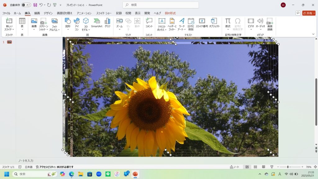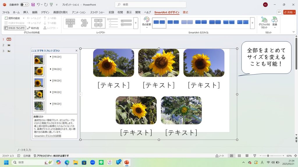 5枚の写真をパワーポイントのスライドにきれいに並べて載せていきます。