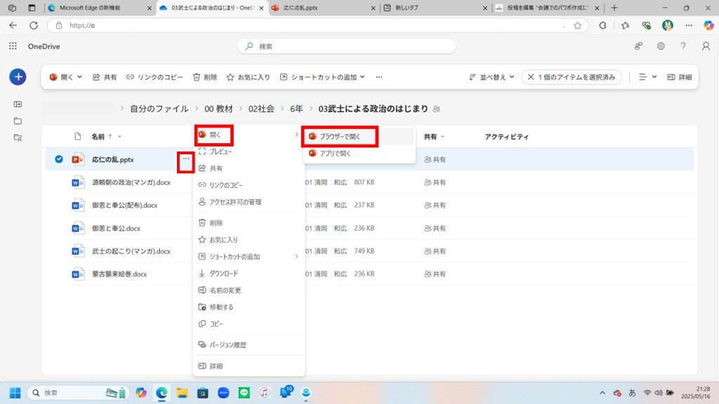 ①使用したいファイルは、「OneDrive」や「sharepoint」に保存します。※ 端末内の保存だとできません。