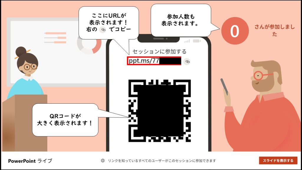 ⑥画面が変わり、URLとQRコードが表示されるので、見てもらいたい人に共有する。