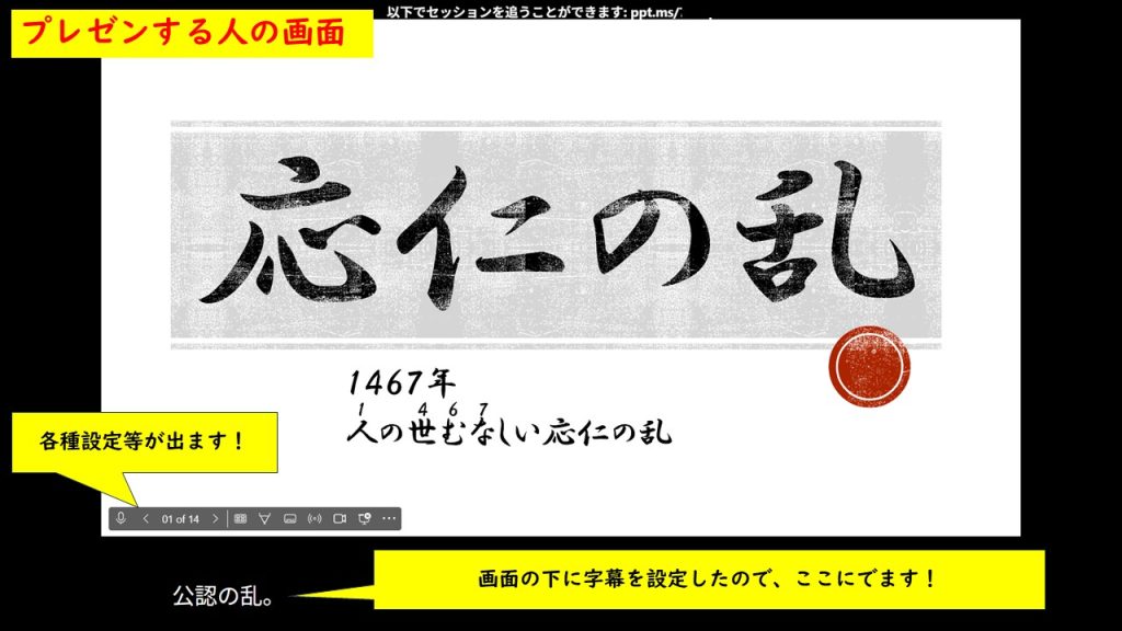 ここを「英語」に変えると…プレゼンしている人の日本語を見ている人の端末で字幕を「英語」に翻訳してくれます!
