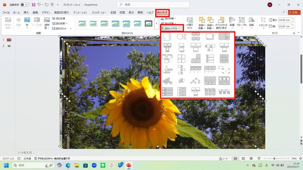 ②「図の形式」⇒「図のレイアウト」を選び、好きなデザインを選択する。