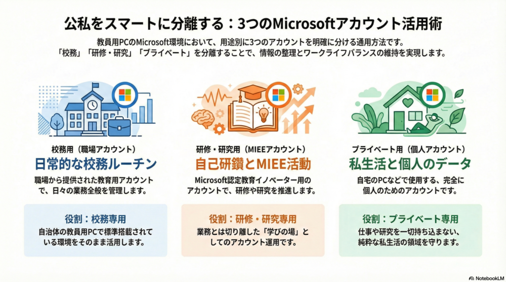 こちらは、アカウントの使い分けをnotebookLMでまとめたものです。